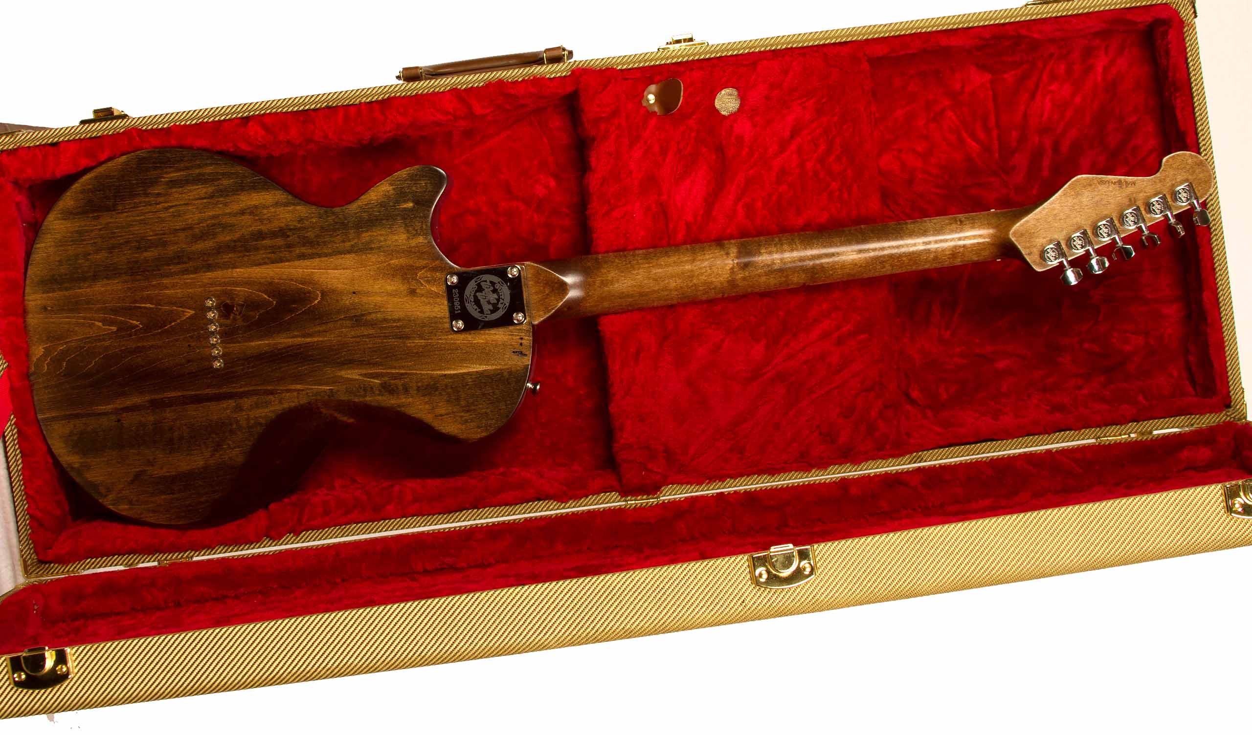 Our guitar bodies and necks are painstakingly finished with our special hand rubbed Tru-Oil process. This process lets the wood breathe and resonate at its full potential. This finish has a beautiful luster and natural texture that give our guitars warmth and a worn-in play-ability.