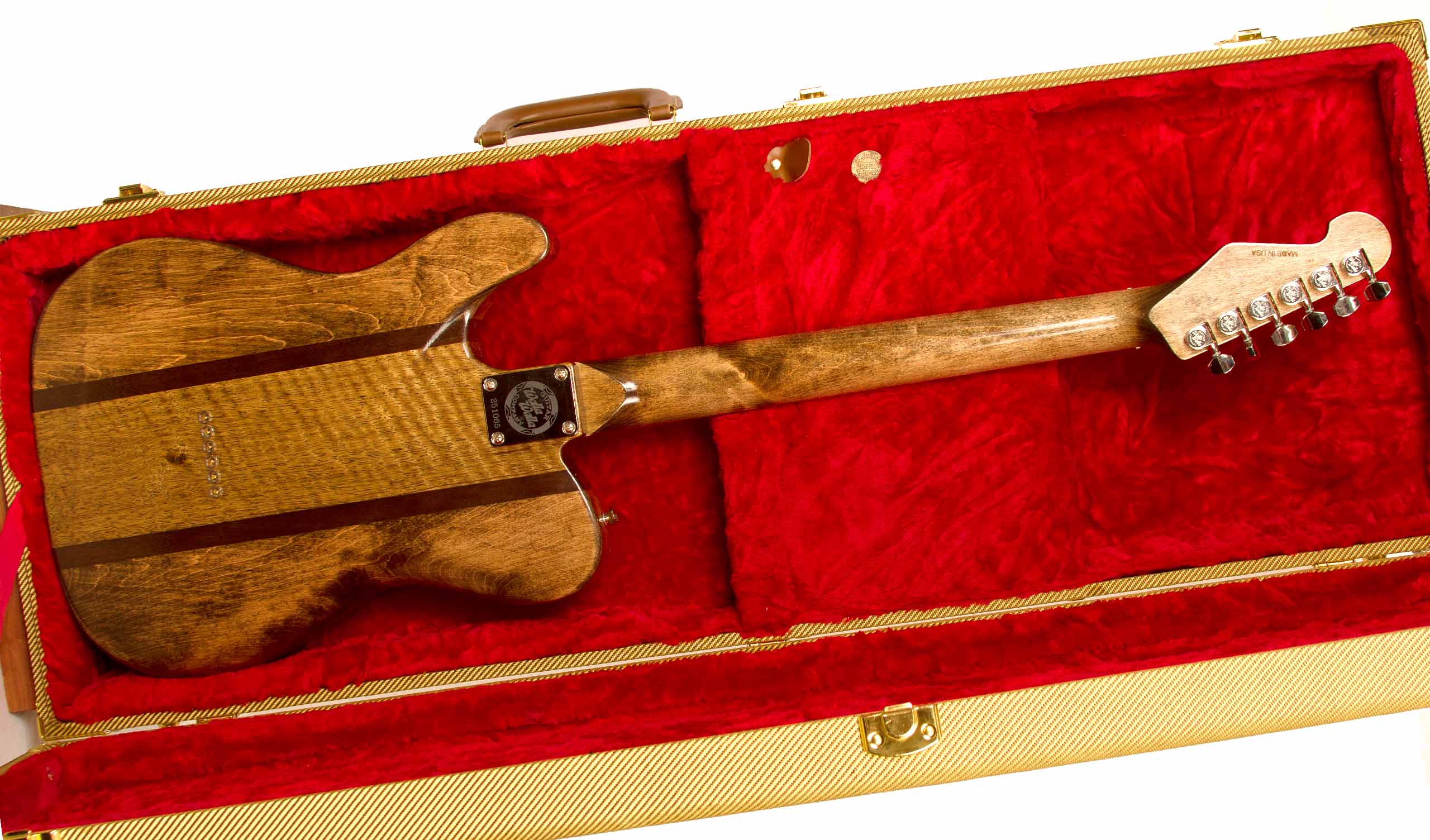 Our guitar bodies and necks are painstakingly finished with our special hand rubbed Tru-Oil process. This process lets the wood breathe and resonate at its full potential. This finish has a beautiful luster and natural texture that give our guitars warmth and a worn-in play-ability.