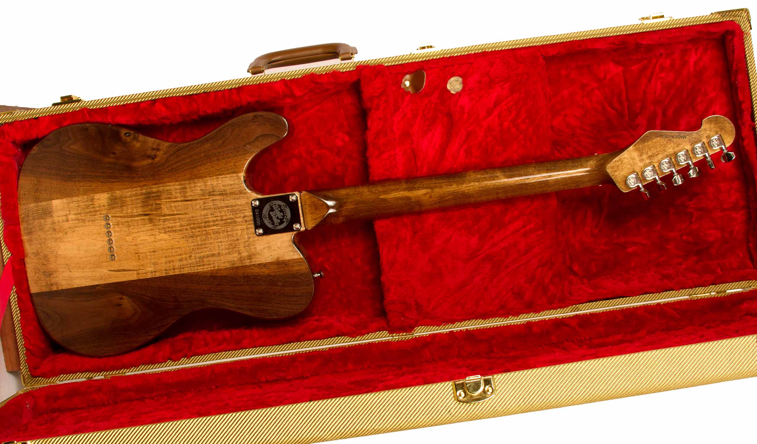 Rugged & Humble Specs: SN:241030 Ambrosia & Walnut Body, Honey Stain with Tru-Oil Finish, Flame Maple 22 Fret Neck, Outlaw-X Bridge, Outlaw-X T2 Pickups, Walla Walla Tuners, and Full Chamber Body. 6.1 lbs.